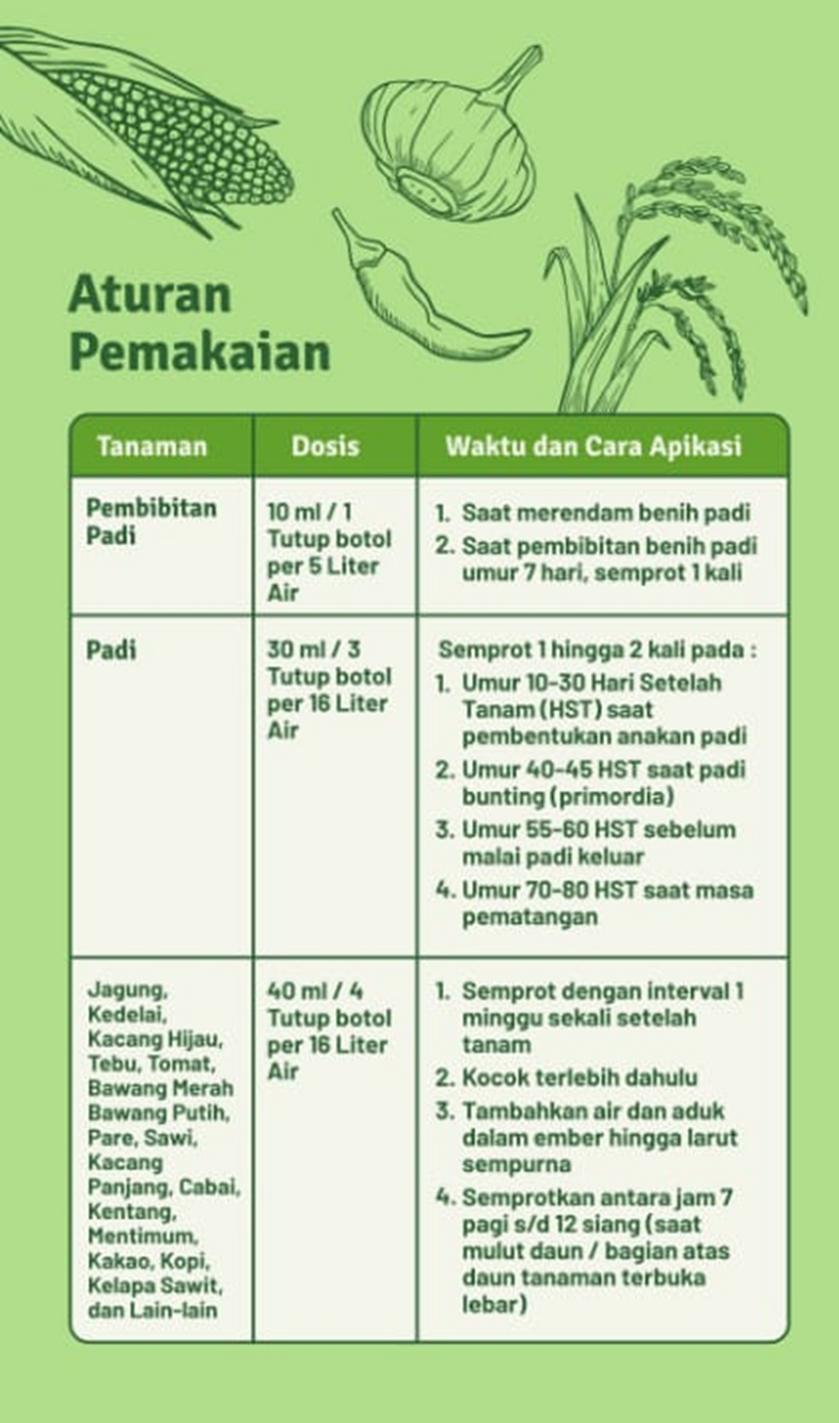 Semprotkan merata pada daun tanaman saat matahari tidak terlalu terik atau saat mulut daun (stomata) tanaman terbuka, pagi pukul 7-9 dan sore pukul 3-4).
